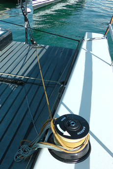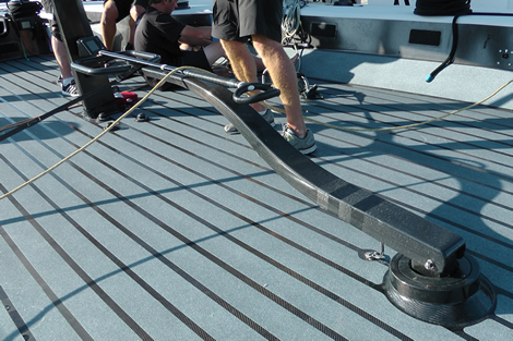 In a tiny well outboard of these tracks is the end of the hobble line. Tim Powell ‘reminds us’ what this does: “You are coming into the bottom mark and you hoist the jib, clip that on, put it on the leeward traveller winch, wind it in and then the jib’s is kind of in when you come to drop the spinnaker and then once the sheet’s off then you can just suck the jib over. It allows us to maintain better control basically.