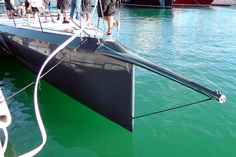 We weren’t allowed to take photos down below but to our untrained eye there wasn’t anything particularly radical. Between the two ring frames around the keel area there is a nice carbon fibre seat from where Steve Hayles gets to navigate from wirelessly, unless he’s on deck. The ring frames however are deeper than they were on the older boat. There is an enclosed head compartment mid-ships immediately forward of the mast fitted with a smart carbon fibre potty.