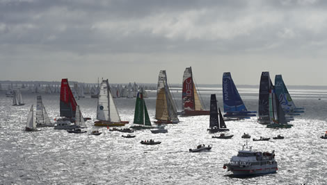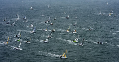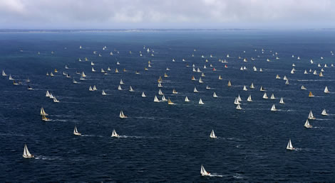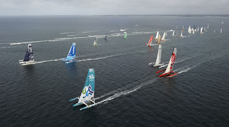 From the Baie de Quiberon, the multihulls set sail to the right of the committee boat, the giant aluminium exploration schooner Tara at over 20 knots, heading through the Chenel de Teignouse between the end of the Quiberon Peninsula and the island of Houat. They soon became small dots on the horizon for the bulk of the fleet, racing on two courses - 382 sailing 'the Grand Tour' at 42 miles and remainder on the 'Petit Tour' at 39 miles.