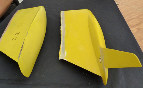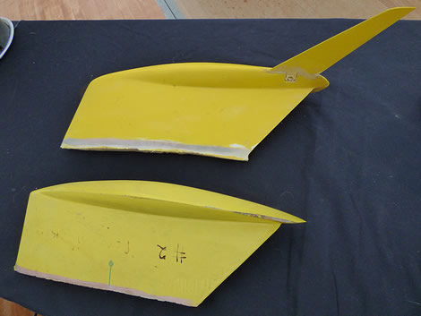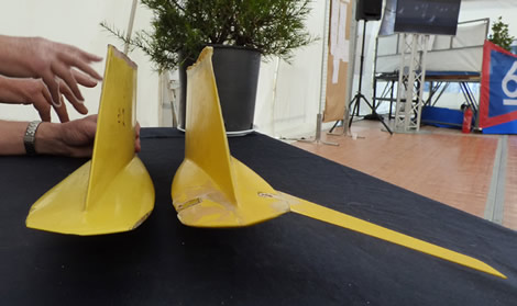 Howlett's test tank models of the keels for Battlecry and Junior (without wings) and Blade and Tsigan (with wings), illustrating Ian's point about the difference in the keels.Howlett's test tank models of the keels for Battlecry and Junior (without wings) and Blade and Tsigan (with wings), illustrating Ian's point about the difference in the keels. play on the second day of the International Six Metre World Championship, hosted by the Société Nautique de La Trinité sur Mer in Southern Brittany.
