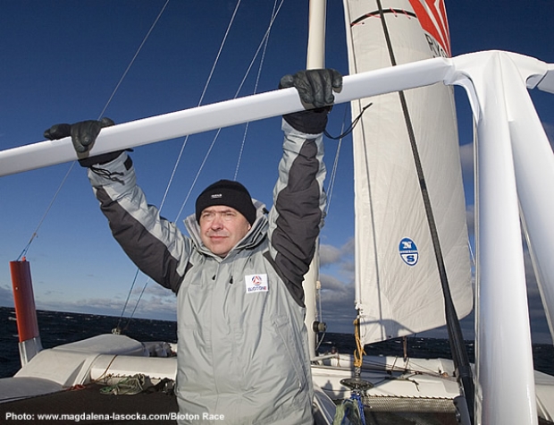 Paszke, who has sailed on Bruno Peyron's Orange and on 60ft trimarans as well as much thousands of miles on Polpharma Warta says he is very happy with the strength and stiffness of Bioton relative too its speed. Launched three weeks ago the boat was quickly delivered to Gdansk for a christening ceremony with her sponsor and during this passage experience bad conditions and was making 18 knots under bear poles!