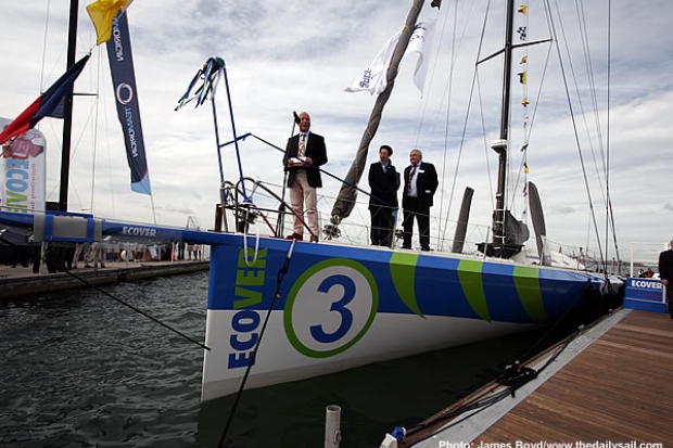 After seeing Dominique Wavre's rather brutal looking Temenos at the start of the Route du Rhum last year, we had our concerns, but the new blue and green emblazoned Ecover, unveiled in the UK recently at Southampton Boat Show, looks to be a weapon.