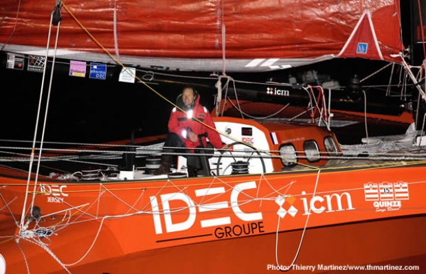 Sunday in Brest Having spent the night alone on board, in the morning Joyon and his faithful steed IDEC 2 were met by an assembled crowd of spectators, family and friends, press and VIPs such as Ellen MacArthur, Jean Luc van den Heede (the present record holder singlehanded on the westabout course), Philippe Monnet and round the world sailor Catherine Chabaud at the dock in Brest's commercial port, the same place where Bruno Peyron's Orange catamarans have tied up after their successful Jules Verne Trophy attempts. Joyon then had a few hours to recuperate before facing the press in the afternoon. Joyon arrived on the stage at Brest Oceanopolis to a standing ovation, alongside his sponsor, Patrice Lafargue, President Directeur General of Groupe IDEC, Professor Gerard Saillant, head of ICM, the Institut du Cerveau et de la Moelle Epiniere (an organisation that researches spinal disease). Slightly surprising was that also on the stage was Jean Todt, head of the Ferrari Formula 1 team, who is, like Joyon, a supporter of ICM.