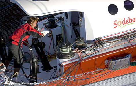 In terms of the handling Coville says that Sodebo may have around a third more sail area than his ORMA 60 had, but the manoeuvring is otherwise much the same. “It takes a bit more time whenever you want to manoeuvre, but even if you want to move the sails like the genniker or the Code 0 it is not that heavy.” Yeah, right!