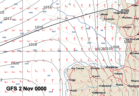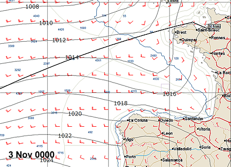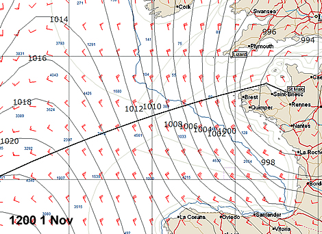 Sam Davies informs us that because the supposed 40 knot winds are to the west of a depression that is rapidly dissipating, it is hard to tell exactly how strong they will be come Sunday night/Monday morning