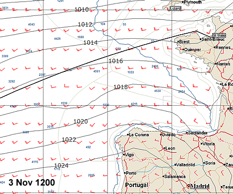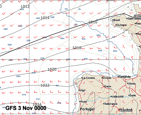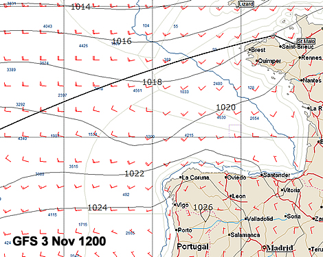 The survivors of the gale will find that the weather (as the forecast stands at the moment) will favour the rich. The Azores high is due to set sail for Portugal over Tuesday and Wednesday and those that dive south to round its eastern side in favourable winds will find the wind decreasing the later they get there until Thursday when this corridor will be completely blocked. Hopefully by then the majority of the fleet will be through and into the trades. At present there don't appear to be too many options for the fleet other than to try and skirt this area of high pressure to the east.
