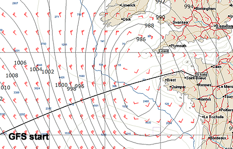 Both the European and American GFS models are starting to align, indicating that for the start there will be a depression centred over the Western Approaches. These should provide 15-20 knot southeasterlies as the gun goes on Sunday and initially the trip west along the north coast of Brittany will be fast. However the centre of the depression is forecast to roll across the fleet overnight on Sunday before the fleet breaks through into the northwesterlies on the west side of this system. These look set to be strong. The frontrunners once past Ushant are likely to find themselves into a building NNWerly gale that the GRIBs are already forecasting to be 40 knots. This combined with the crossing of the continental shelf will make for lively potentially boat breaking conditions for the competitors.