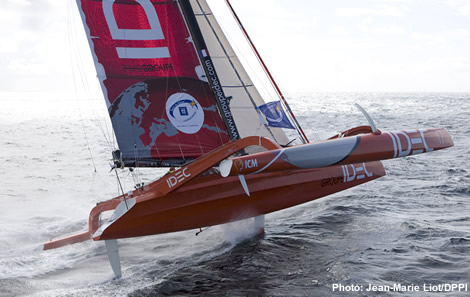 Read about Joyon's 2004 round the world lap here, more about his background here, and on his last round the world record here.