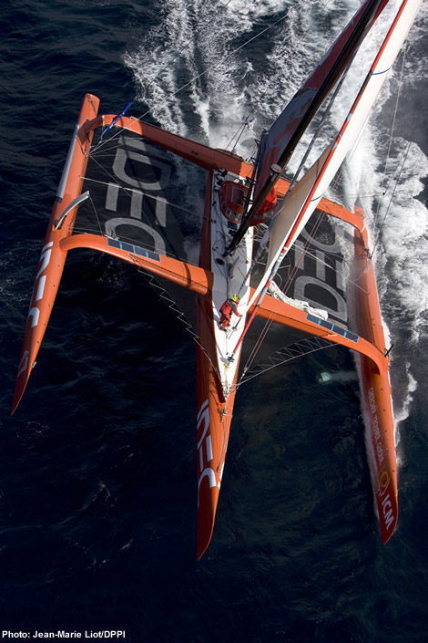 After the disastrous 2002 Route du Rhum when battered by storm force winds all but three of the 18 ORMA 60 starters failed to finish – including our man, who’s trimaran capsized – Joyon changed tack and embarked on a campaign to break the world’s foremost singlehanded ocean records. To do this he acquired Olivier de Kersauson’s 1986 vintage maxi-trimaran, in which de Kersauson with a crew, had spent the previous years attempting to break the Jules Verne Trophy record (although in 1989 de Kersauson himself had sailed this boat around the world singlehanded in a time of 125 days).