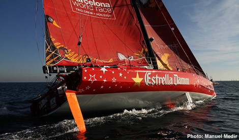 For this Barcelona World Race, Ribes is co-skippering the red-hulled Estrella Damm with Spanish former Mini sailor Alex Pella. Although it is a Farr design and the same generation, this boat is not the same Estrella Damm that sailed the last race with Jonathan McKee and Guillermo Altadill (that subsequently went on to become Seb Josse’s Vendee Globe steed BT and most recently Roland Jourdain’s Route du Rhum winner, Veolia Environnement). It does however have a good pedigree in the Barcelona World Race being no other than Jean-Pierre Dick and Damian Foxall’s former Virbac Paprec 2, the boat which won the first event.