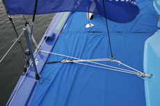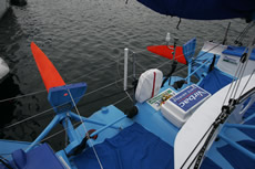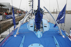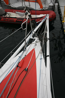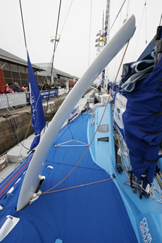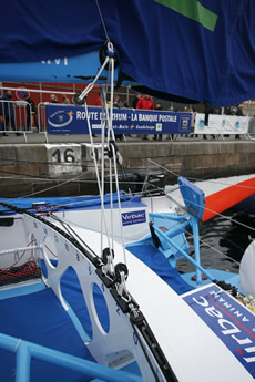 The deck spreaders on PRB, as has been pointed out since Yves Parlier first introduced them on his Aquitaine Innovations Open 60 some 15 years ago, allow a reduction in weight aloft of the standing rigging, but they have also been found to offer a convenient sheeting point for smaller downwind headsail. However other IMOCA 60s without them have got around this by having removable jockey poles, as Verdier points out that the deck spreaders are not always in the right place.