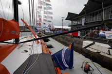 “The specification was to make something really light,” says Nicolas Abiven for the reasoning behind the cabin top choice for Virbac Paprec 3. “We wanted all the lines to go straight and to avoid any deviation blocks and Jean-Pierre wanted to steer in a protected area and see everything from there. So when we put all these specifications together we came quite naturally to the two pods. What is true is that it is a bit less protected but Jean-Pierre is not really concerned by that.” While the doghouses look very protected, apparently quite a lot of water and spray gets sucked into them from behind. Then of course there is the deluge of water that funnels down between the pods...