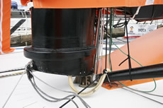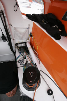 For simplicity and lightweight the keel has the only hydraulics on board Virbac Paprec 3. While they have locks on halyards, the downhauls are all handled on blocks and tackle arrangements, again representing a weight saving. This is also the case with PRB.
