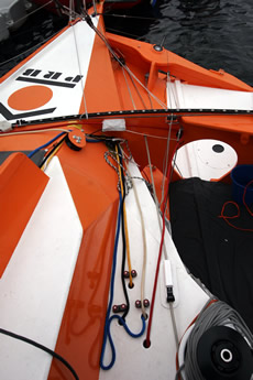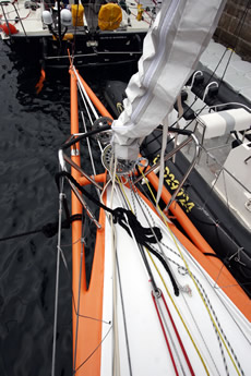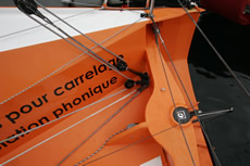 All three boats have now dispensed with the MichDes C-shaped track used for the mainsheet, vang and as a means of preventing the main from accidentally gybing, as we saw on both Desjoyeaux’s Vendee Globe winners. Instead all have a shorter (and thus lighter) elliptical track, however the difference is that on for example PRB, the sheet attached a long way forward along the boom with the result it doubles as a vang. Foncia of course differs – her track is for what is effectively the vang and there is a separate mainsheet running to blocks on the transom.
