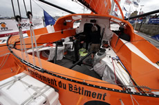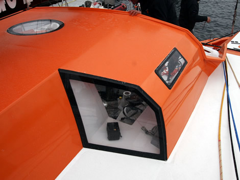 On Virbac Paprec 3, the extension of the doghouse on each side allows standing headroom down below, even for towering Jean-Pierre Dick.