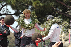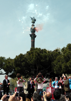 Very good. Nor are they giant fur balls. In fact the giant brown balls were given out at the finish of the first Barcelona World Race (they are supposedly depictive of the World crews have just sailed around). As they hadn't twigged the symbolic nature of their spherical gifts, the skippers on that occasion entered into a game of 'catch' with the Spanish princess who had presented them. To make it much more obvious this time around (and to prevent a repeat of such un-regal behaviour) the globes have on them some judiciously positioned pearls interlinked with gold thread depicting the course...Blackburn 05/04/2011 - 15:29
