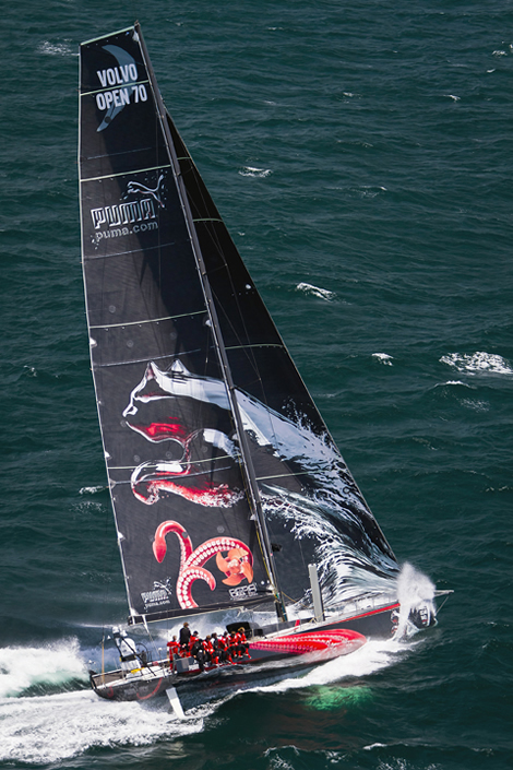 Designed by Juan Yacht Design and constructed at New England Boatworks, Inc., in Portsmouth, R.I., the third generation Volvo Open 70 monohull was uniquely created to sail around the world and face extreme conditions. With a distinct chine that runs from bow to stern, Puma’s Mar Mostro design was tested thoroughly by Juan Kouyoumdjian’s team with input from the Puma Sailing Team. The yacht weighs 14 metric tons, with a 4.5m draft and 5.5m beam, and is expected to attain speeds of more than 40 knots during the race.