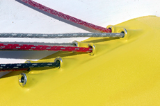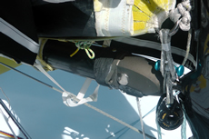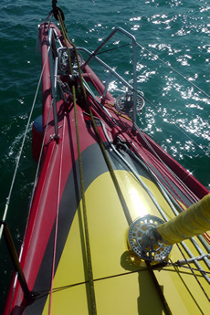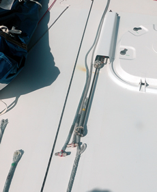 On this occasion all the sails are on hooks, whereas on Stamm’s previous boat the mainsail and spinnakers were held on halyards. As seems to be popular in France, the hooks come from different manufacturers depending upon which sail they are being used for. The standing rigging is Southern Spars’ carbon fibre EC6.