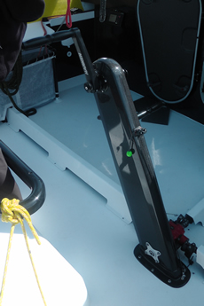 When we were on board there was no additional protection for the helm other than the cabintop. Stamm says that he plans to fit some sort of sliding system to offer cover over the helming position each side. The tiller in the pictures below is not the definitive item as it is too close to the grinder and will probably be replaced with a V-shaped affair. The twin rudders kick up but when Stamm discussed these the indication is that they were fitted more for their performance (less drag) rather than their safety benefits.