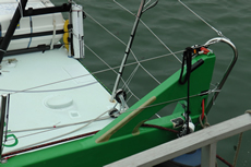 The bottoms of the asymmetric boards on Groupama are slightly toed in from vertical and they are located just forward of the mast protruding on deck midway between the centreline and the gunwale.