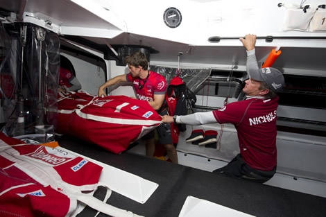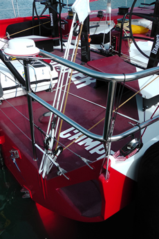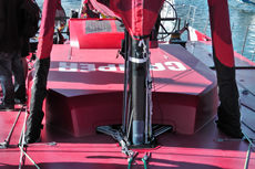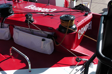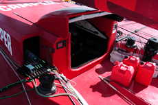 Another change to the rule this time around is that boats must have a prop shaft that retracts within the hull. Thus a more efficient fixed 550mm three bladed propeller is now used, instead of the folding prop fitted to boats in the last race. According to Cox this requires a longer prop shaft being fitted, although he points out that this, along with the media desk and the windage-heavy antennae tower above the transom, represent performance hits that all the teams have to take.