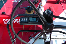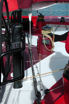 Camper's cockpit differs from the other VO70s in having her mainsheet pedestal aft of the mainsheet track. As usual immediately forward of the main sheet track there is a central island for the mainsheet winch with a control panel for the hydraulics on the aft side of this. The winch/pedestal package is from Harken. Running forward on each side is the 990 traveller winch, then a smaller Harken 50.2 winches for the traveller, which are also used to sheet the staysails, then the 1111 primaries and then finally the pit winches, where there are two to starboard and one to port.