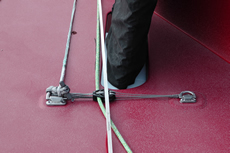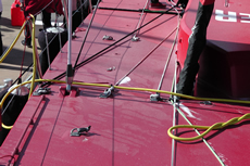 As on most VO70s, the majority of the control lines for the headsail fairleads operate through a block and tackle arrangement, the blocks attached to padeyes. On Camper the exception is for their biggest jib where there are tracks either side of the aft end of the cockpit (mounted on the cockpit bulkhead).