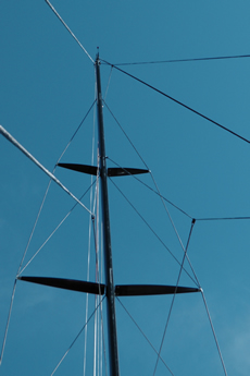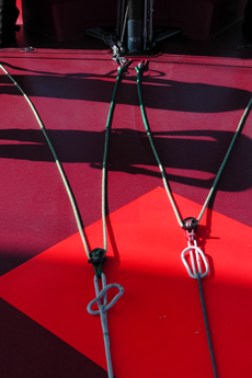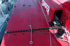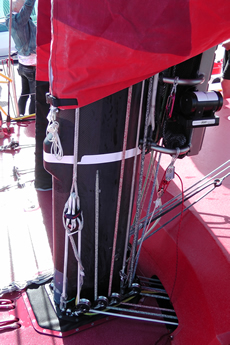 As described yesterday, Camper’s most unique feature is the relative fore and aft positioning of her mast, keel and daggerboards. One advantage of having the daggerboards adjacent to the mast is that the uphaul lines for the boards can be taken off the mast, as they were on ABN AMRO Two.