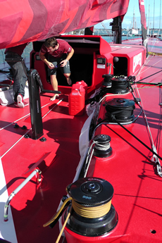 However there are hydraulics for standard sail functions such as the outhaul, Cunningham, upper checkstays, jib car, etc. Cox says that Camper has more hydraulics than they had on Puma last time and part of the reason for this came from crewman Stu Bannatyne’s experience on Ericsson 4, the hydraulics allowing for more grunty control while the weight of some of the rams can be included as part of the rig weight.