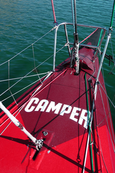 Like all of the new VO70s, Camper’s gunwhale from the mast forward is cut-off. The reason for this Cox says is that it is a bit lighter (one side of a triangle, instead of two), plus it is better for windage and controlling the way spray comes off the boat.