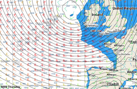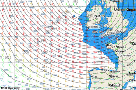 While the European model used in our maps indicates the low to be tracking quite far north, others are showing the track of the depression centre to be further south. “If it stays south it is do-able,” continues Golding. “My mental cut-off is if the low centre is south of the southern tip of Ireland. If it is mid-Ireland [as our GRIBs show] it becomes a long way to go.”