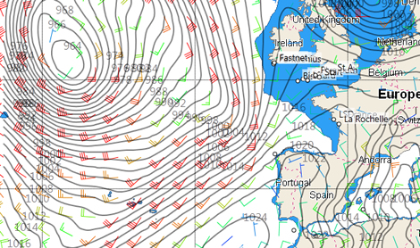 Although the weather forecast promises fair winds for the first 24 hours conditions deteriorate from Tuesday on with the arrival of the large very deep depression generating storm-force conditions for 48 hours: sustained winds of 45 knots, gusting to 55-60 knots with 8-10m seas forecast behind the cold front.