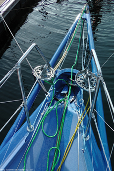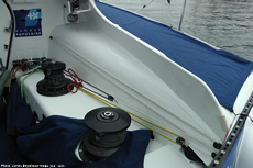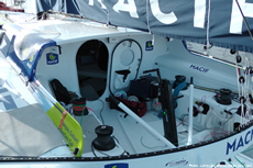 Down below on MACIF, as on Banque Populaire and on MichDes' Farr-designed Vendee Globe winne,r the lines from the mast drop down to just above the keel box and then are fed back to the pit area on each side of the companionway via two fairly obtrusive beams running through the middle of the ‘saloon’ area. This lowers the centre of gravity of both the ropes and the turning blocks, but also allows any water coming down the apertures in the deck to run away into the keel box.