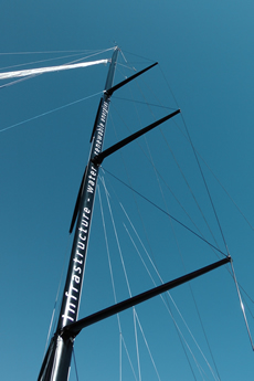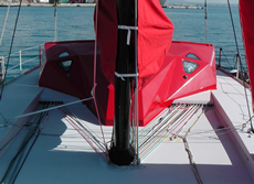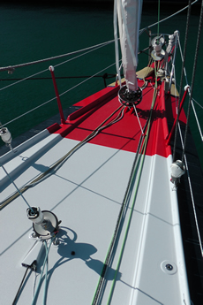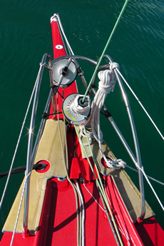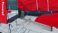 Because solar panels don’t work at full efficiency when they are even partly obscured, the spinnaker sheets and the runners are piped into the cockpit below deck.