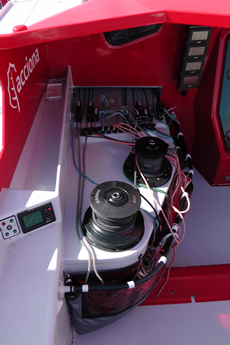 The cockpit is fitted with a primary each side and an extra pit winch to port with a single coffee grinder that can drive any of the winches. The winches are from Harken and fitted with load sensors.