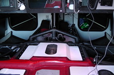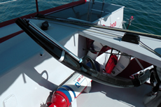 The aft half of the cockpit area is taken up by a large articulating solar panel (not shown in the photos), so the working area of the cockpit is forward, continuing the trend we are seeing in IMOCA 60 design at present, back towards smaller, safer cockpits that shorthanded crews are less likely to fall out of. The solar panel area is divided off from the working area of the cockpit forward by the slightly dished main sheet track and the beam supporting it. On this are mounted two winches for the mainsheet and traveller.