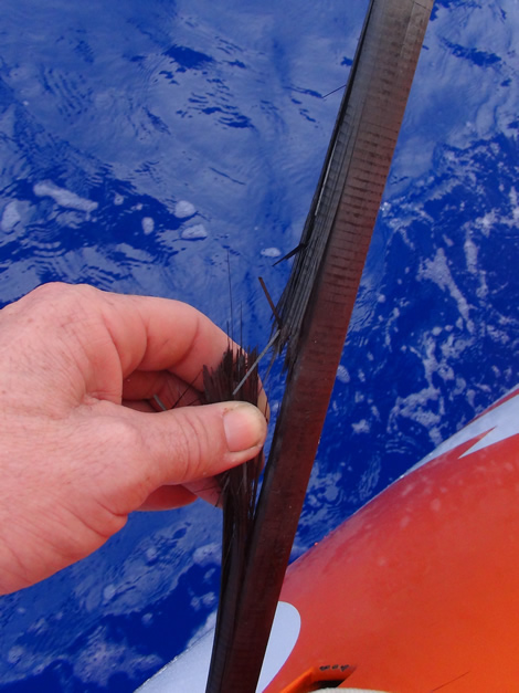 Below is a photo of the damage showing where the outer laminate and also much of the honeycomb core was carved out by the buoy.