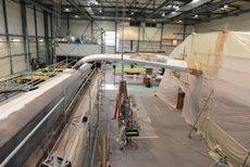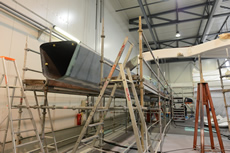 The recycling process obviously placed some constraints on the design of the new boat. Fortunately Sodebo was one of the widest ORMA 60s, being virtually square (ie 18.2m wide, as well as long) and as her crossbeams were reused – along with the bulkhead structure used to attach these beams to the hulls, so her overall beam remains as it was. Similarly as her rotating wingmast and boom have been reused, the distance between the mast step and the main sheet track have had to remain the same. With the boat gaining 20ft LOA, the mast, originally stepped on Sodebo’s forward crossbeam, has moved aft on Prince de Bretagne.