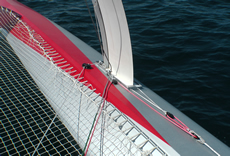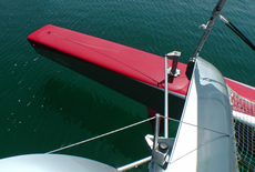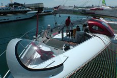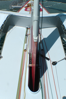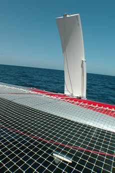 The new hulls have greater freeboard than the originals and less rocker. Their underwater shape Lucet describes as being half way between a V and a U, but most noticeable is that their bows have a reverse sheer (ie Dreadnought) and are thus wavepiercing, but unlike boats like Groupama 3 and Banque Populaire, the very end of the bows have been lopped off, giving the bow more of an arrowhead shape.