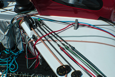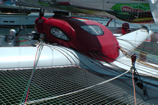 With her slick red and silver paintjob, that Prince de Bretagne has been recycled is all but un-noticeable. However as VPLP naval architect Quentin Lucet points out: “In between the two beams, it looks like it has been squeezed at deck level a little bit, because we reused the beam bulkheads which gave us a fixed width at deck level that we had to consider when we designed the hull. So at both beams [to hull joins], it is wider than in between the two beams.”