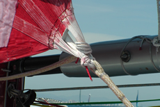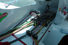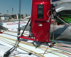 In terms of her sail plan, the mainsail area remains comparable with Sodebo’s, but now has a larger foretriangle, with the chain plates moved by up to 1m forward from their equivalent position on the ORMA 60. The chainplates on her mast have also been moved and there are now locks on all the halyards with more within the boom for the reef lines. As with all of the big offshore tris built in the last decade, with no maximum length limit there is no bowsprit – the tack of the big downwind sails is now attached to the bow of the main hull.