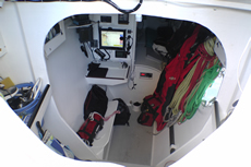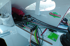 Equally Prince de Bretagne’s foils in the floats are state of the art circa 2002 (when she was originally built), curved and with a hook at their end, and thanks to subsequent developments in the bigger G-class multihulls (ie Banque Populaire and Groupama 3) and more recently with the AC72s, these are now looking a bit dated. However these foils do have the ability to have their pitch changed while sailing. Lemonchois says he is contemplating updating the foils and when we mention L’Hydroptere and suggest an arrangement that might allow Prince de Bretagne to fly, AC72-style there is a certain glint in his eye that suggests this would be not out of the question some day.