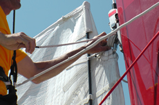 However with Prince de Bretagne, the ORMA 60 recycling has been a little more extreme. Whereas Gitana 11 was merely lengthened, in creating the new Prince de Bretagne, the former Sodebo platform was broken up into its component parts – three hulls, two crossbeams and a semi-circular beam for the main sheet track. Unlike Gitana 11, the three hulls were discarded in their entirety and replaced with new ones, however almost all the rest of the boat has been reused. Most significantly this includes the twin crossbeams and the mainsheet beam, plus the numerous appendages – daggerboard in her mainhull, the curved lifting foils in her floats, plus three rudders - as well as her rig (new for the 2006 Route du Rhum) and much of her deck hardware.