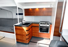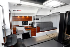 With her fit-out, the normal compromises have been made between creature comforts and weight. But with Caro there is a proper galley with, for example, an oven rather than a Bunsen burner and the owner has his own cabin in the bow with a wet room and shower. However the wash basin and head are made of carbon fibre, as isthe shell of the navigator's seat and in fact the whole of the interior, which is overlaid with a paper-thin veneer of Cocobolo hardwood.