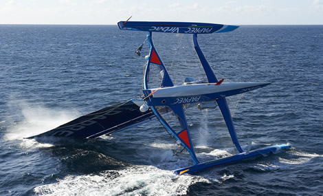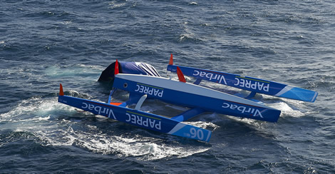 At the time the boat's doublehanded crew Jean-Pierre Dick and Roland Jourdain were sailing in 15-20 knots of wind. They were surprised by a strong gust and were unable to prevent their multihull from capsizing conventionally over its leeward. The mast broke into three pieces.