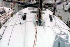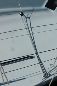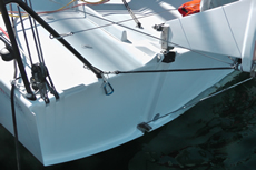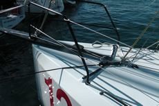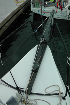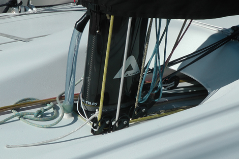 Most Class40s are fitted with a rotating bowsprit that enables the clew of the kites to be brought up to weather, a kind of A-sail version of squaring the pole, enabled deeper angles to be sailed downwind. The aluminium cup around which the bowsprit swivels is mounted right on the tip of the bow with the forestay going through the middle of it to maximise the J measurement. Tack lines neatly feed into the sprit and emerge at its forward end, while the aft end of the sprit is mounted on a semi-circular track to help control its rotation.