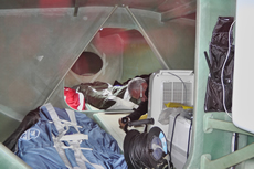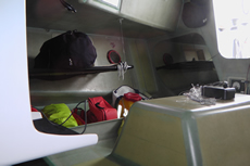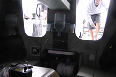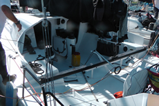 Down below, the finish is immaculate, but the layout very spartan, while complying with Class40 rules, including for example four fixed berths (ie not pipecots) and a chemical toilet forward. There is panel for the nav instruments aft of the main bulkhead including a small table for a computer keyboard - the whole rotates so the navigator can do his job while sitting to windward. The galley slides out from under the forward end of the cockpit and comes with a small plastic washbasin and single burner Camping gas stove. The 'saloon' area is well illuminated thanks to two forward facing windows having been fitted where the cabintop flares out, jib sheet tackle.