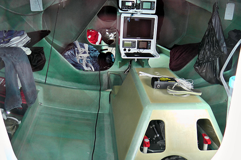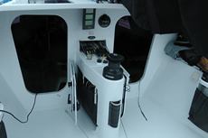 The cockpit is open ended to allow water to drain aft, but the crew is kept in the forward part of the cockpit thanks to the elevated main sheet track that spans almost the full beam of the boat. While there is are twin rudders, these are operated by a single tiller. All electronics on board, including the all-important autopilot, are by NKE.