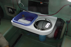 There are two shallow water ballast tanks each side and these extend most of the way aft to the transom. Typically the forward tank gets filled first. Unlike some of the other new designs (which dump water and then simply bring it on board afresh on the new tack), a substantial transfer pipe is fitted, allowing water to be dumped to the leeward tank before tacking.