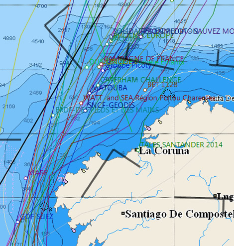 Leader Sébastien Rogues and Fabien Delahaye on their Mach 40 GDF SUEZ made a pitstop (also to repair their wind instruments) at Muxia, just north of Cape Finisterre for 50 minutes at around 0200-0300 this morning and impressively rejoined the race course -Ferrari-style - still ahead their second placed sistership, Jörg Riechers and Pierre Brasseur on mare. While Rogues and Delahaye were 20 miles ahead at the final sched yesterday and at the latest sched their margin over their Franco-German opponent is still 20 miles.